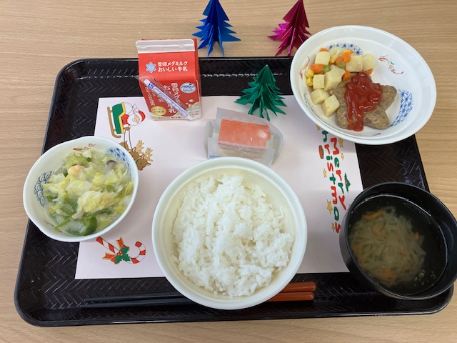 2025年12月25日 / 最終更新日 : 2026年1月15日 hanakeian お知らせ メリークリスマス ❣ クリスマスの行事食、小さなケーキも花を添えました。 本日のメニュー:ご飯・星のハンバーグ・キャベツのクリーム煮・サンタさんのイチゴケーキ・牛乳(628kcal) 施設内もクリスマスの雰囲気が漂っています