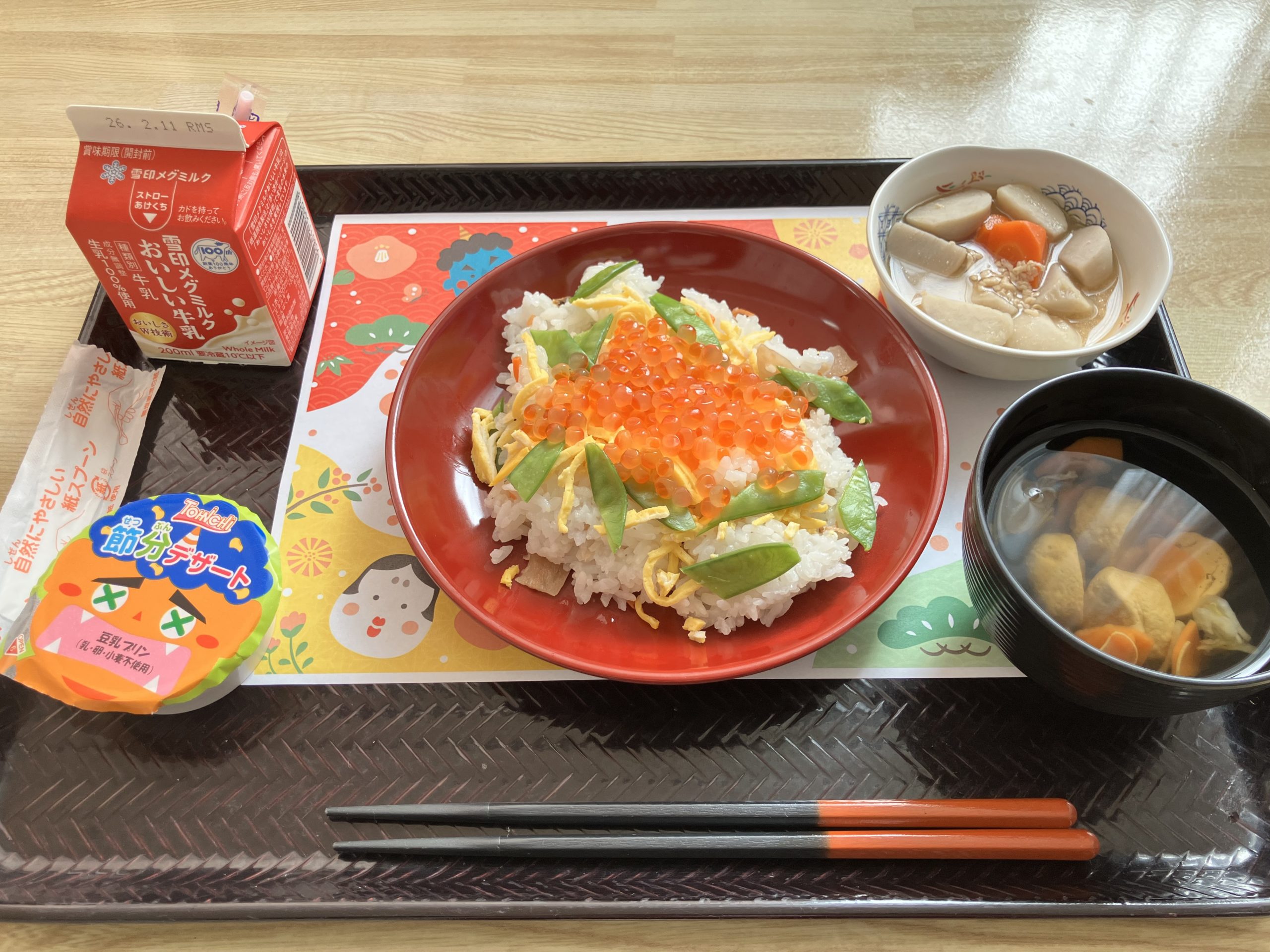 2026年2月3日 / 最終更新日 : 2026年2月3日 hanakeian お知らせ 本日の昼食(2月3日) 本日は節分の行事食です♪ <メニュー> ちらし寿司、つみれ汁、里芋そぼろ煮、豆乳プリン、牛乳200ml つみれ汁が特においしかった!つみれ汁で節分を感じれてよかった! (80代 男性) 節分にいわしを食べたり飾ったりするのは、「鬼を追い払う」「邪気を寄せつけない」という意味が込められた、昔ながらの知恵です。さらに、栄養価が高く冬にぴったりのいわしは、家族の健康を守る食材としても活用されてきたそうです。