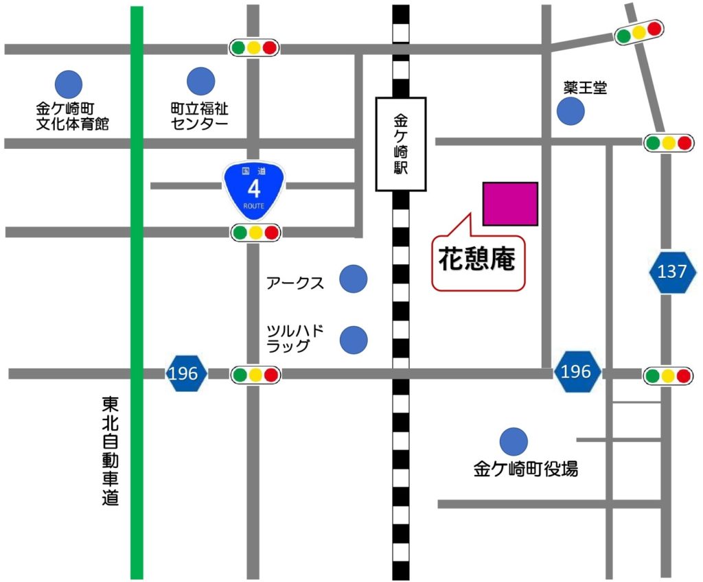 東北自動車道、水沢インターチェンジを北上、約4㎞。北上金ケ崎インターチェンジを南下約6㎞、東北本線金ケ崎駅東口の近隣です。
